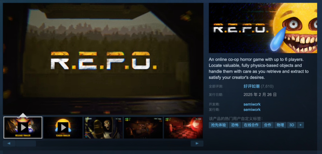 独立游戏的战场从来不是资源的比拼,而是创意与执行的较量。《R.E.P.O.》证明,只要找准方向,小团队也能在巨头环伺的市场中杀出一条血路。