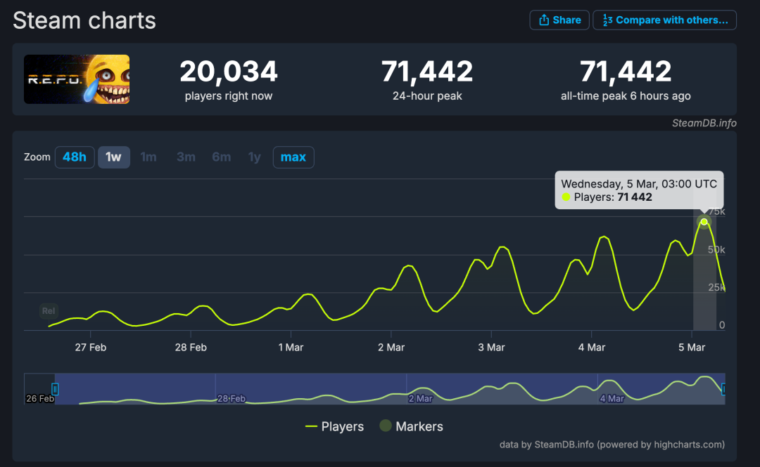 2025年2月26日,一款名为《R.E.P.O.》的合作恐怖游戏悄然登陆Steam。首周销量突破20万份,最高同时在线玩家数飙升至71,442人,Steam好评率高达97%,根据VG Insights的数据预估已经卖出20万份,按照7.99美元的价格计算,总收入也已经达到了160万美元。