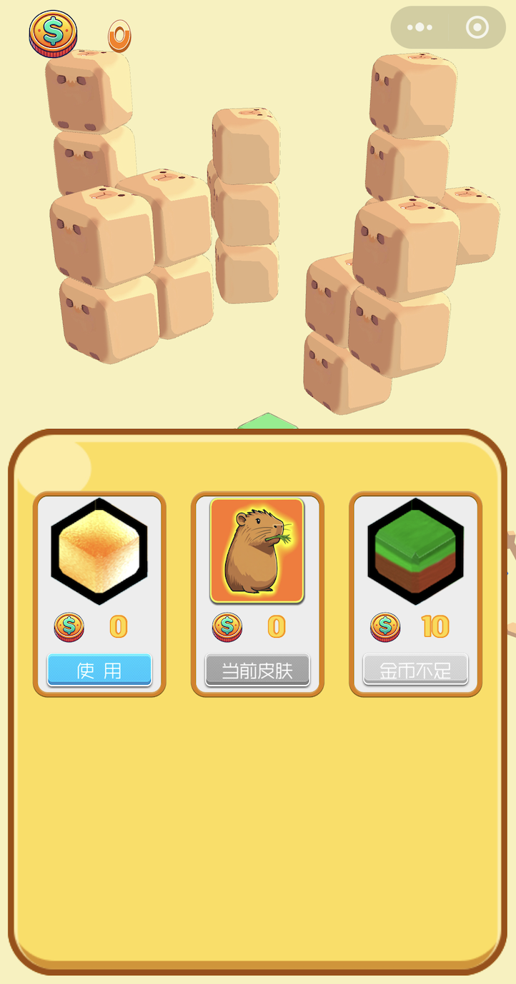 游戏还提供了皮肤系统,目前上线了两款皮肤:“草地方块”和“卡皮巴拉”。后面我会不断推出更多好看好玩的皮肤,也满足大家的收集欲。
