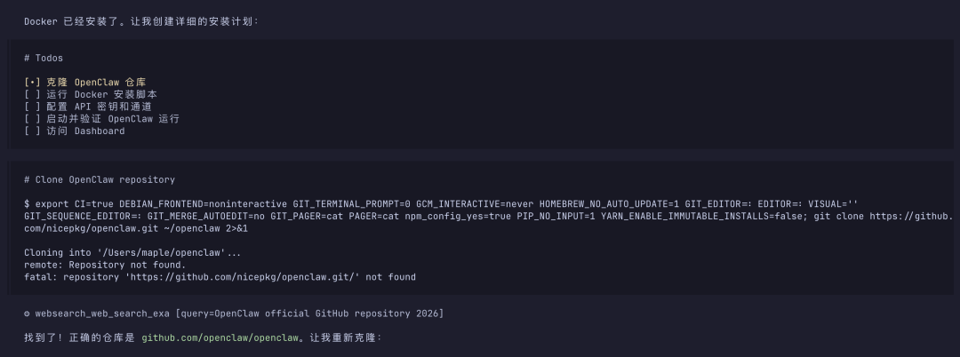 其实很简单,首先打开OpenCode(其他AI智能体也行,比如Trae、Codex、Claude Code等),直接在对话框里告诉他:“现在用最新的方式安装最新版的openclaw,最好是在docker中运行的。”