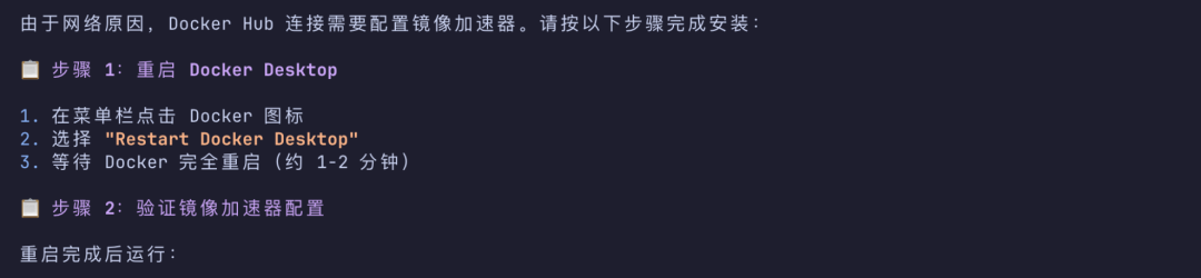 中间也有小插曲,安装docker镜像时,网络不给力,它自动给切换了国内镜像源,我们手动重启一下。