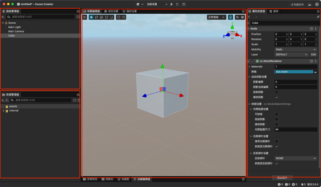 打开Cocos Creator后,先熟悉以下几个主要面板: