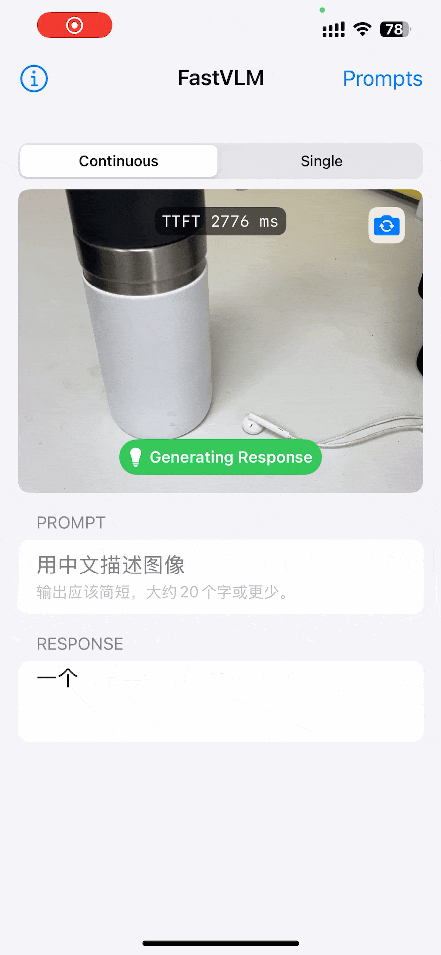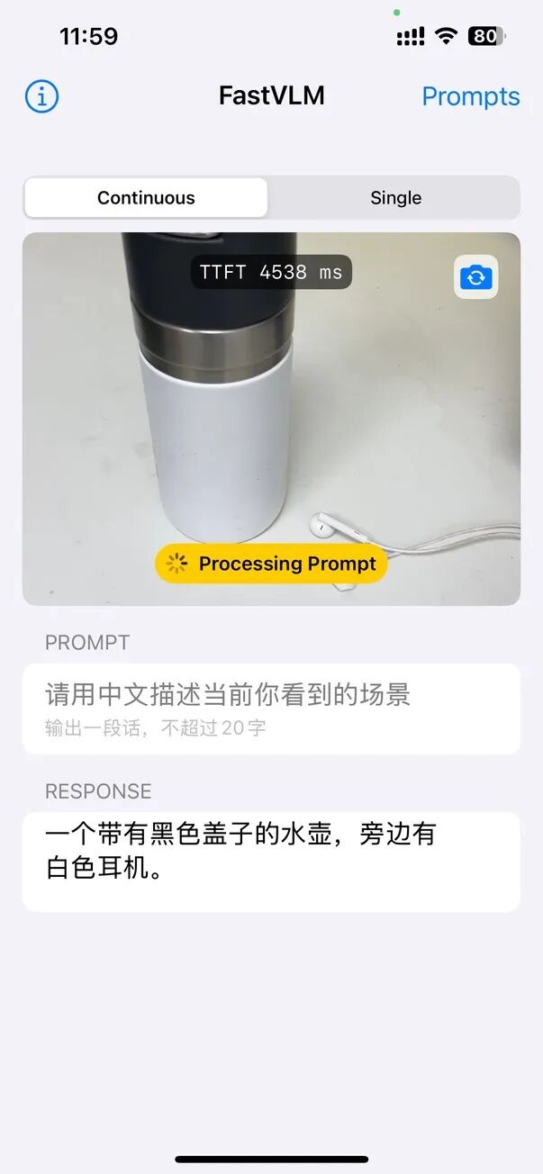 首先就是“快”,官方宣称其 Time-to-First-Token (TTFT) 速度相比一些现有模型有着巨大的提升,这在我简单的测试中也得到了印证,我在iPhone13pro上运行,识别速度虽然有延迟(1~2s),但是已经是令人可以接受的程度了,要知道这可是4年前的机器。