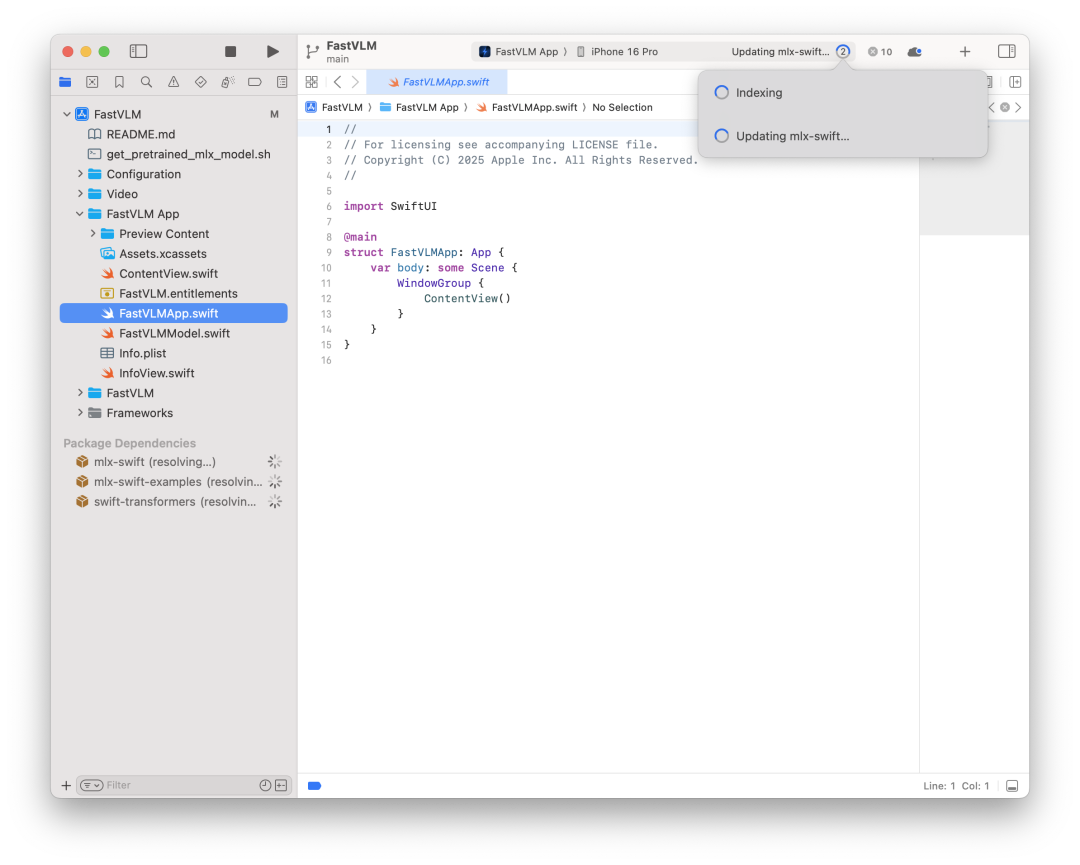 app页的步骤很简单,我们只需要下载一个get_pretrained_mlx_model.sh脚本,这个脚本能够自动下载代码和模型放到合适的目录结构,下载完成后,就可以在XCode中直接编译运行了。 执行以下步骤: