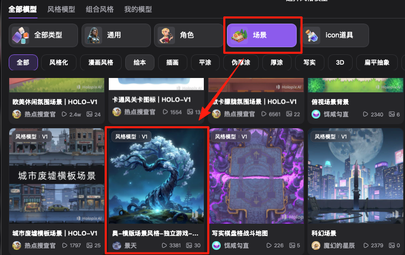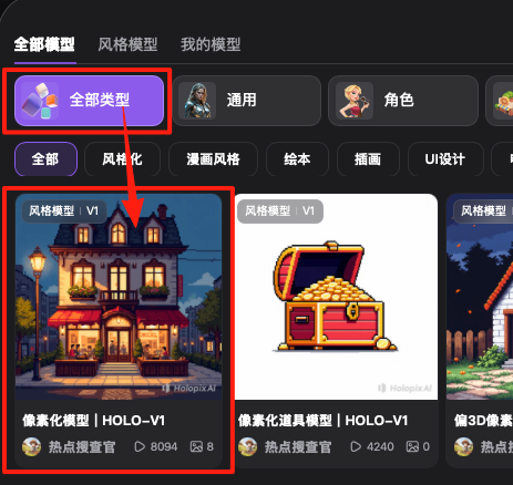 HolopixAI 本身为游戏而生,有很多专门为游戏美术优化的模型,可谓是是指哪儿打哪儿。