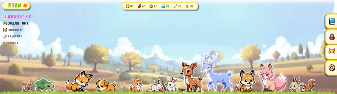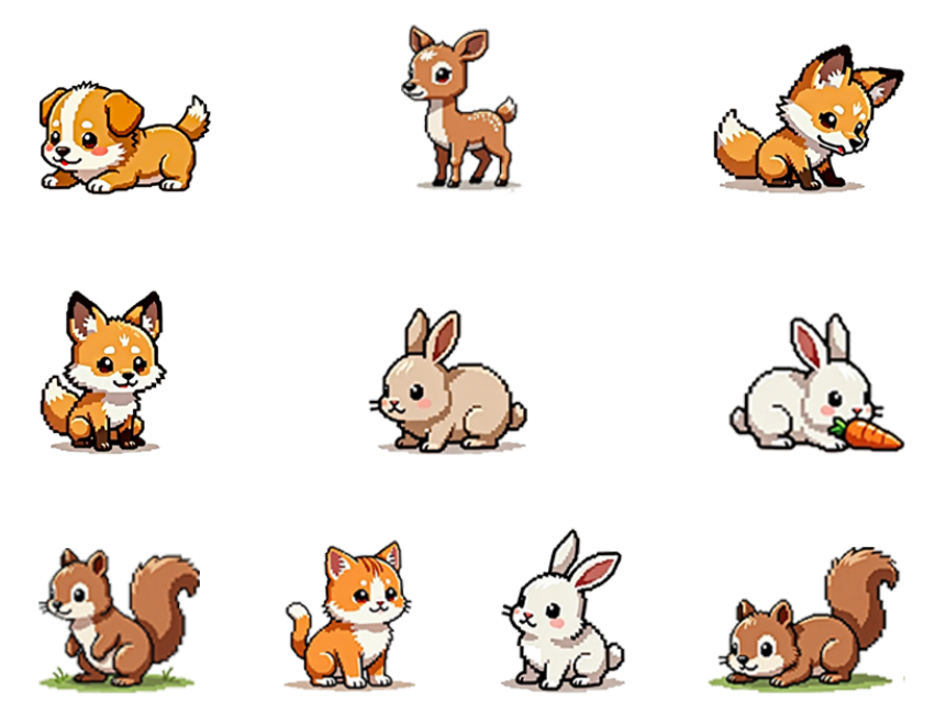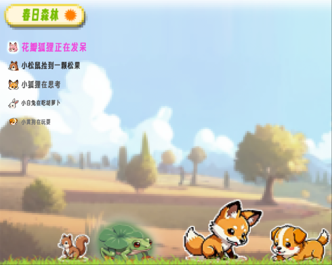 最后生成了一批小动物,有小狗、小猫、兔子、小鹿、松鼠等,每一只都圆乎乎的,看着就让人想点进去互动。