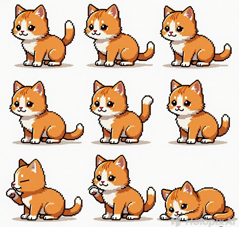 Q版小猫,橘猫,横版2D像素风角色,动作包含:待机(甩尾巴)、走动、吃东西(舔爪子)、睡觉(蜷缩打呼),卡通可爱,多图,整齐排列