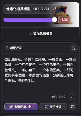 这次我们使用【像素画道具模型】来生成道具UI。可以一次性在描述中生成多个道具UI。