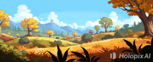横版2D像素风格中景背景,全部是低矮的树木和灌木丛,上面留出大量空白,画面明亮,地面平坦,横版平坦地面,笔直的地面,广角镜头,细节适中,色彩柔和,分层感明显,适合叠加使用,像素风 / Q版手绘风格。