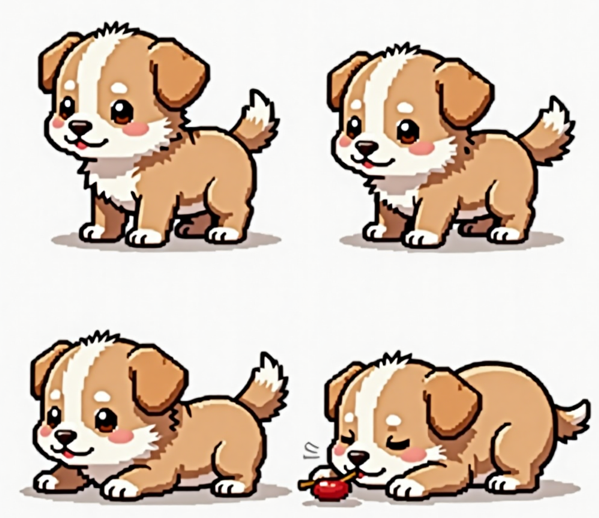 Q版可爱小狗,横版2D像素风角色,动作包含:待机摇尾巴、慢走、吃东西(低头)、睡觉(蜷缩),卡通可爱风格,sprite sheet,多图,整齐排列