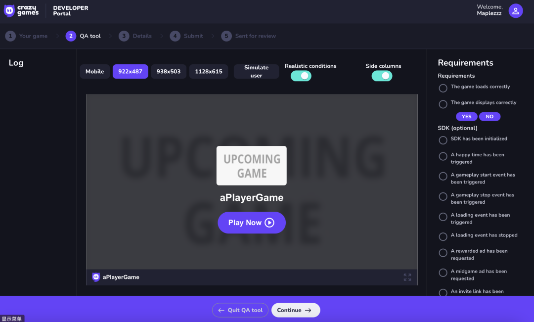 上传完成后,会进入到QA工具界面,可以帮你进行一些基础的测试,包括分辨率适配、SDK适配、其他兼容问题等。完成这一步,说明的你的游戏在这个平台可以正常运行了,也大大提高审核通过的概率。