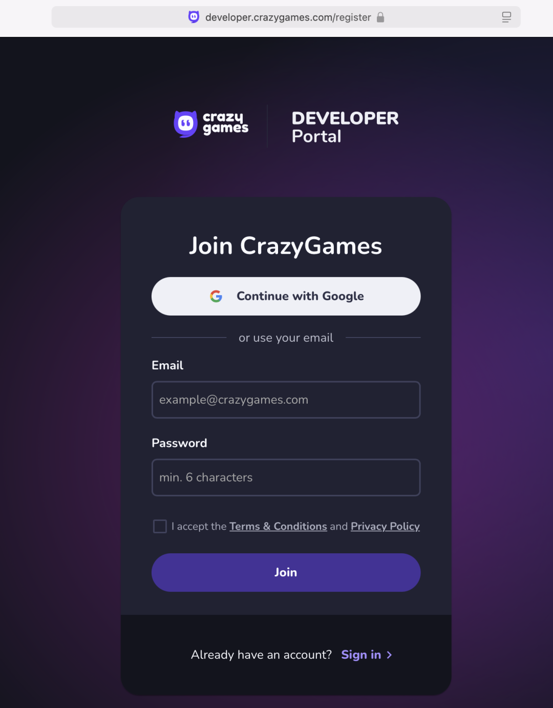 访问CrazyGames的开发者页面,申请一个开发者账户。也可以用你的Google账号直接注册。