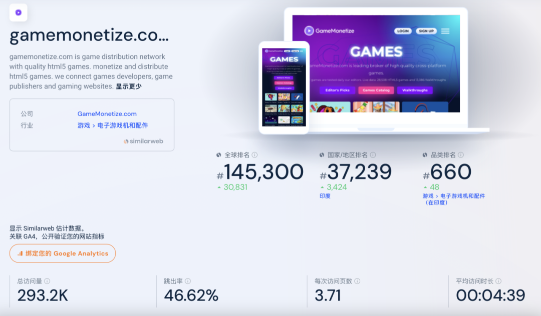 根据 Similarweb 的数据,GameMonetize 的全球排名约为第 145,300 位。在“电子游戏机和配件”类别中,排名约为第 660 位。月访问量约为 293.2K,跳出率为 46.62%,每次访问页数为 3.71,平均访问时长为4分39秒。