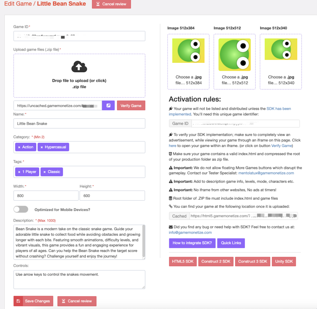 上传发布过程也十分简单,填写游戏基本信息、介绍、玩法。上传游戏代码和图标。正好,上期我们使用AI做了一款贪吃蛇游戏(感兴趣的可以去看看:不会写代码,也能用AI做小游戏吗?),我们把这款游戏传上去做测试。