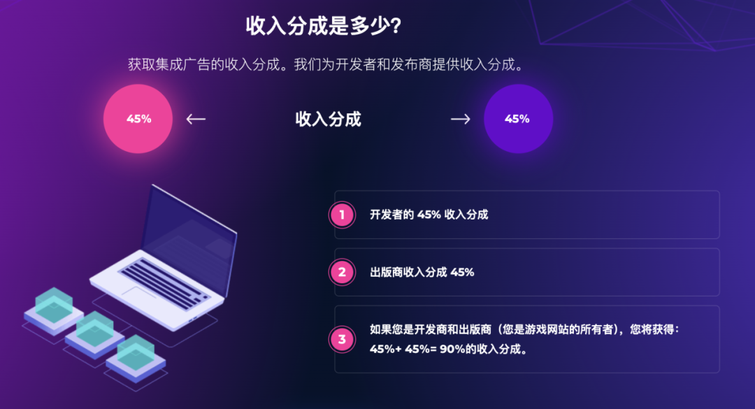 发行商的主要角色是推广游戏,发行商从 GameMonetize 的游戏库中获取HTML5 游戏,嵌入到自己的网站或应用中。在这些嵌入游戏中展示的广告收入,发行商可以与平台分成,分成比例也是45%(如果你同时是开发者和发行商,那就能拿到90%的分成)。高质量的小游戏还可以为你的网站增加人气和留存率,这也算隐形收益了。