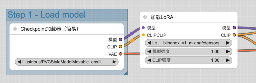 我找了一个PVC风格的模型,我想用它做出盲盒手办的感觉,于是在模型后面增加了一个LoRA模型,这个LoRA模型是盲盒风格,这样做出来就有盲盒手办的感觉了。