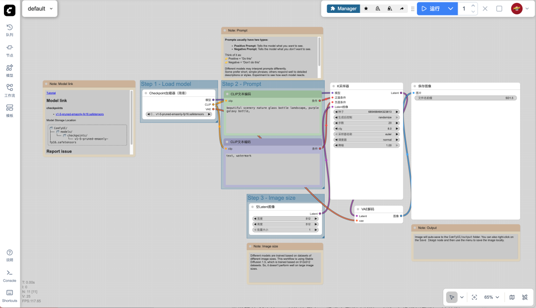 当打开界面时,你可能是一脸懵逼的。不过没关系,直接点开左侧栏的“模板“”,然后就能看到很多官方做好的流程模板,选一个最简单的“图像生成”,这就是一个最基础的工作流了。