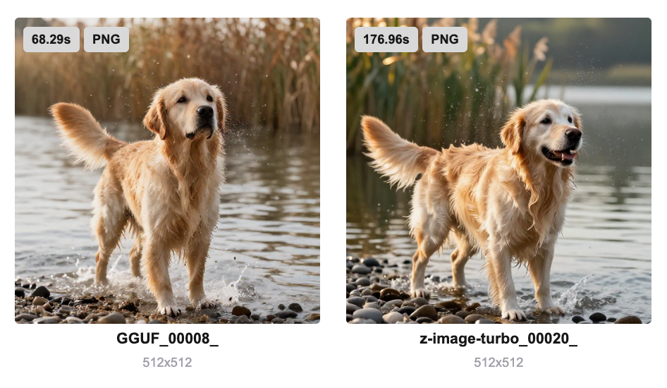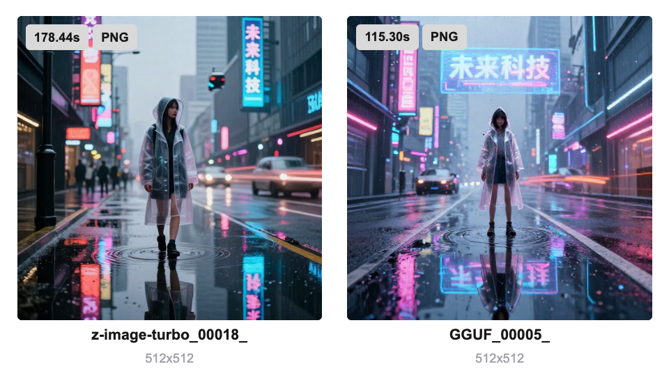 基于我的电脑配置,目前运行原版z-image-turbo还是有点慢的,512*512分辨率下大概需要160~200秒。而GGUF版本模型在相同分辨率下,可以控制在100秒左右。这个速度应该还可以优化,带我后续研究研究。