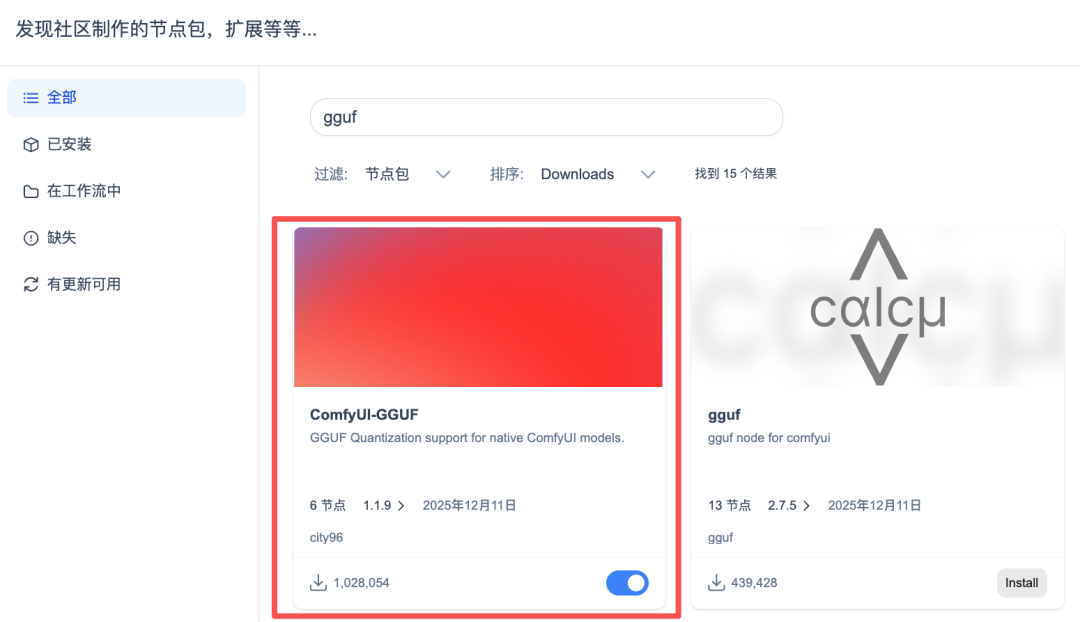 在使用GGUF模型前,需要安装ComfyUI-GGUF插件。