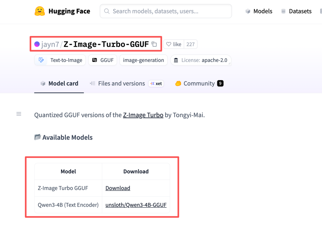 我选择的是jayn7/Z-Image-Turbo-GGUF, 下载了Q3_K_S版本,最轻量,但效果不会差太多。