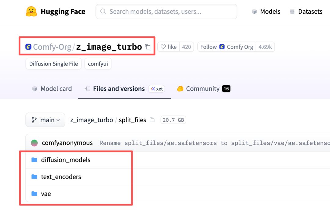 官方模型是发布在HuggingFace和魔搭社区的,但是这次我们要用ComfyUI运行,所以直接下载ComfyUI打包好的3个文件即可: