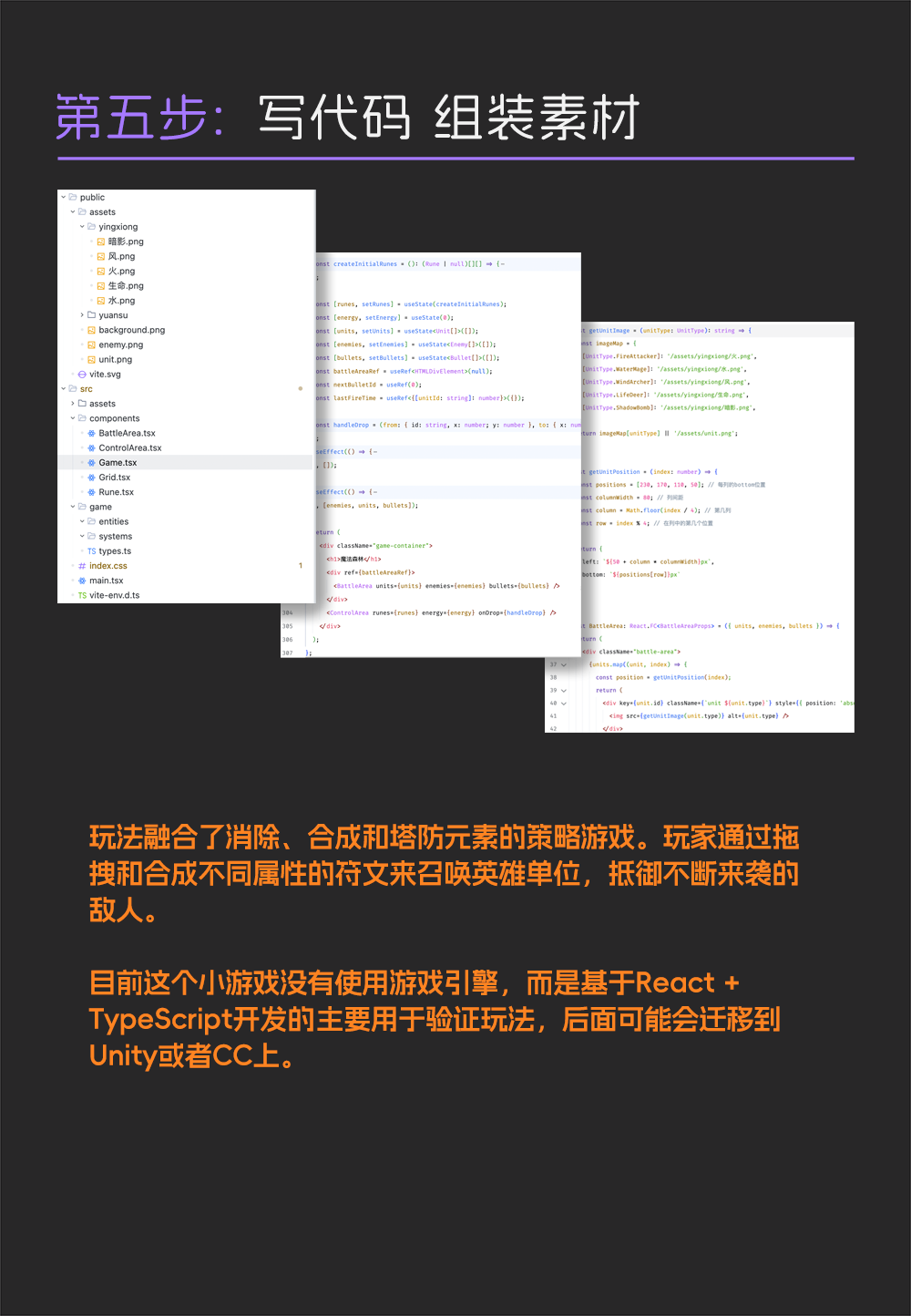 由于是游戏玩法的快速验证,所以我让AI基于React + TypeScript快速搭建游戏场景,并实现了元素融合、融合等级、召唤元素英雄、英雄攻击、怪物生成、获得能量等功能,完美实现了MVP版本验证玩法的目的。