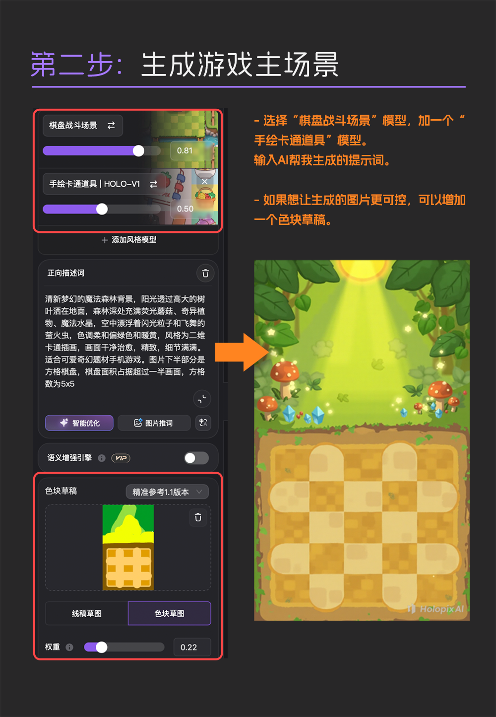 有了提示词,现在我们到 Holopix AI 中输入关键词:“清新梦幻的魔法森林背景,阳光透过高大的树叶洒在地面,森林深处充满荧光蘑菇、奇异植物、魔法水晶,空中漂浮着闪光粒子和飞舞的萤火虫,色调柔和偏绿色和暖黄,风格为二维卡通插画,画面干净治愈,适合可爱奇幻题材手机游戏”,很快就生成了用于背景与图块的完整素材。