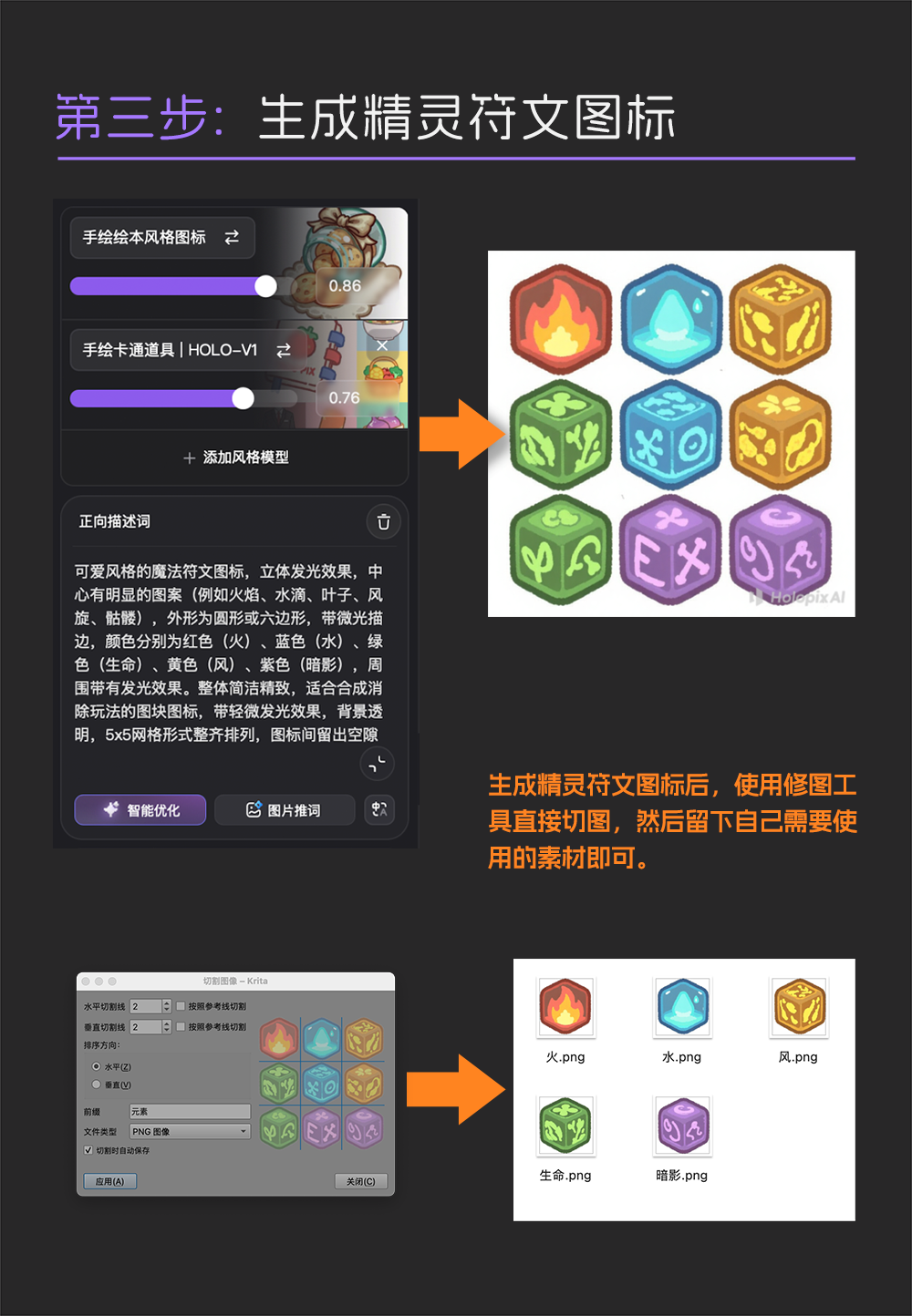 然后使用工具一键切图,这样我们的精灵符文图标就准备好了。