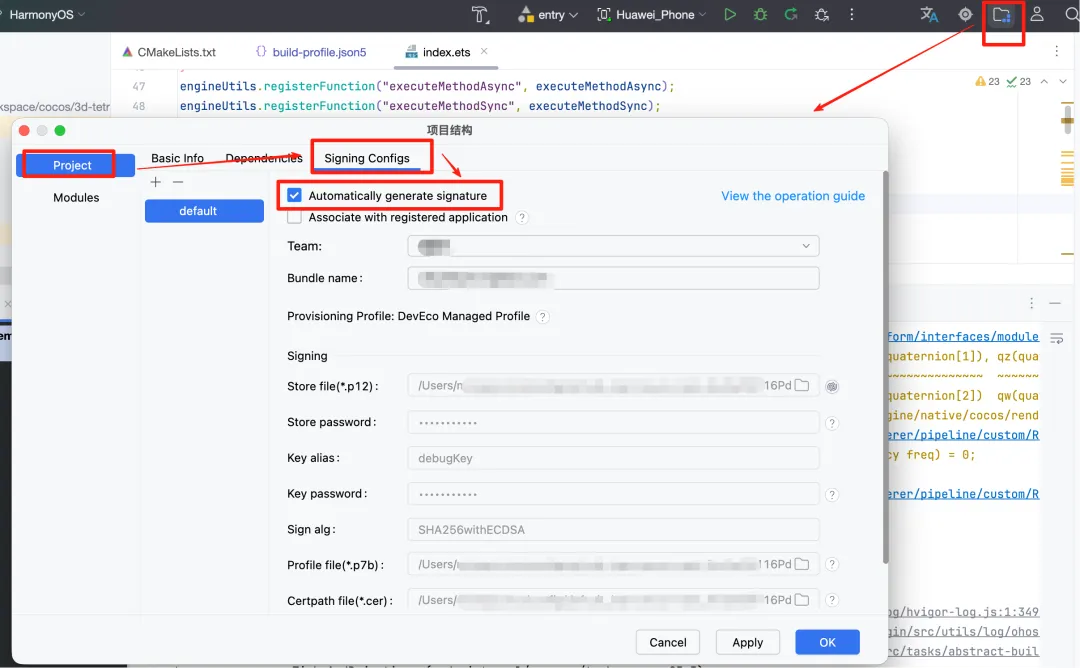 接下来需要配置签名,点击右上角的“项目结构”,进入“Project—Signing Configs”,勾选“Automatically generate signature”,开发调试时使用自动签名即可。