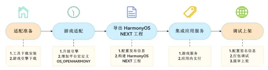流程是这样的:先在 Cocos Creator 里构建工程,生成 HarmonyOS NEXT 项目;然后导入到 DevEco Studio,接入鸿蒙的 SDK 和服务,最后签名、编译、打包上传。