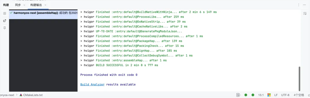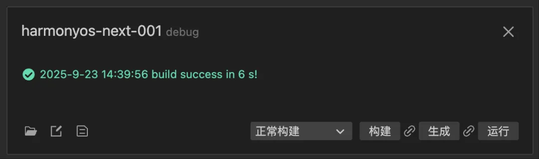 点击构建,很快就构建完成了。注意,这里不要点击后面的“生成”和“运行”。因为现在已经生成了HarmonyOS Next工程了,后面编译打包的工作需要去DevEco Studio上去完成。