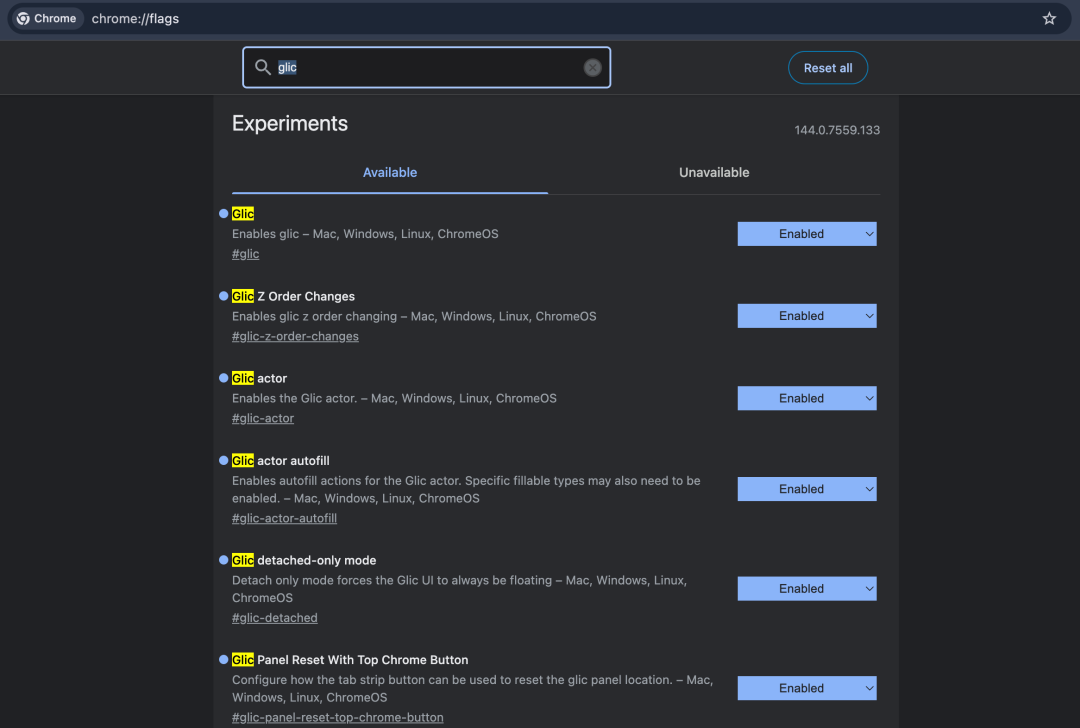 在地址栏中打开chrome://flags/,搜索“glic”,把以glic开头的选项设置为“Enable”。