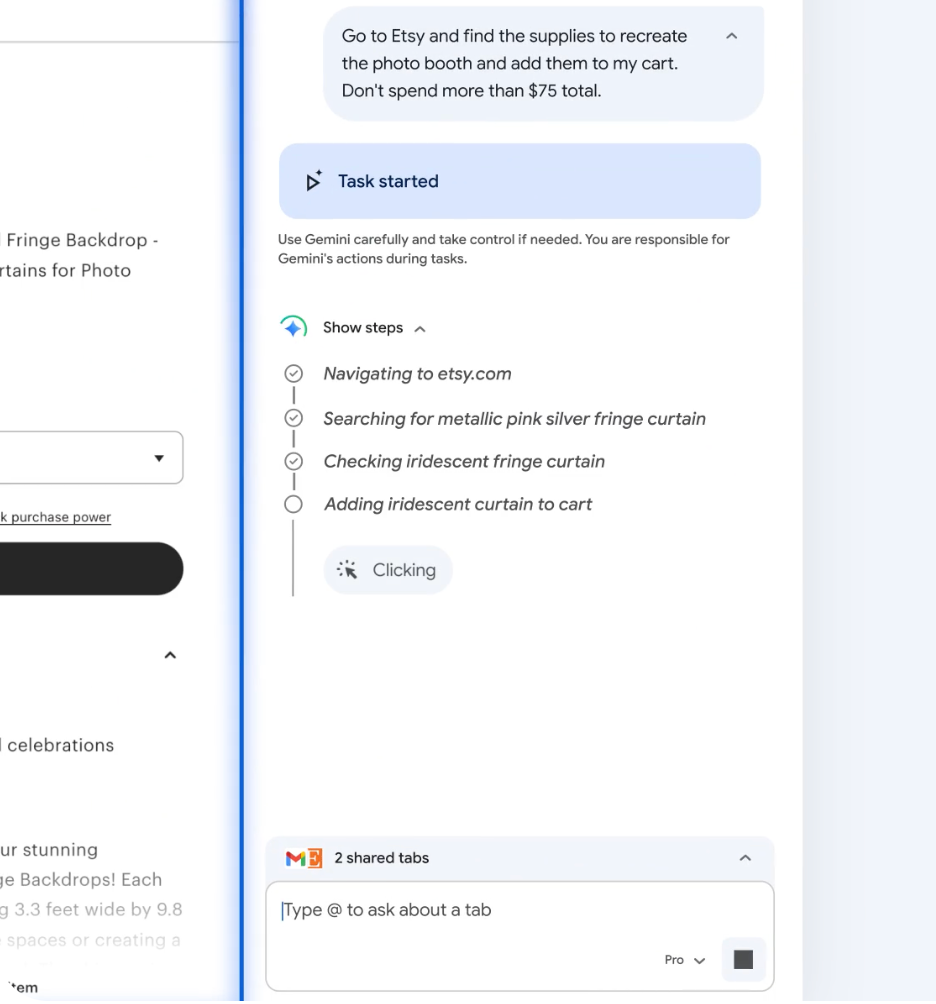 自动浏览 (Auto Browse):  对于预订预约或活动策划等任务,可以直接告诉 Gemini 您的需求,它能够像智能体一样在网页上自动执行复杂任务(如订票、填写表单)