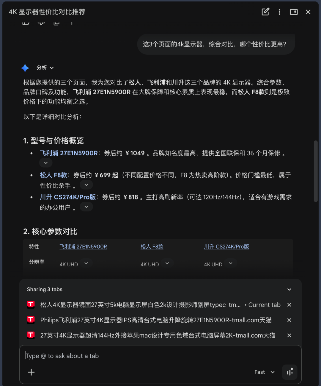 轻松比较选项:  能够整理多个标签页的信息,对比不同产品的规格、优缺点,辅助用户做出决策。