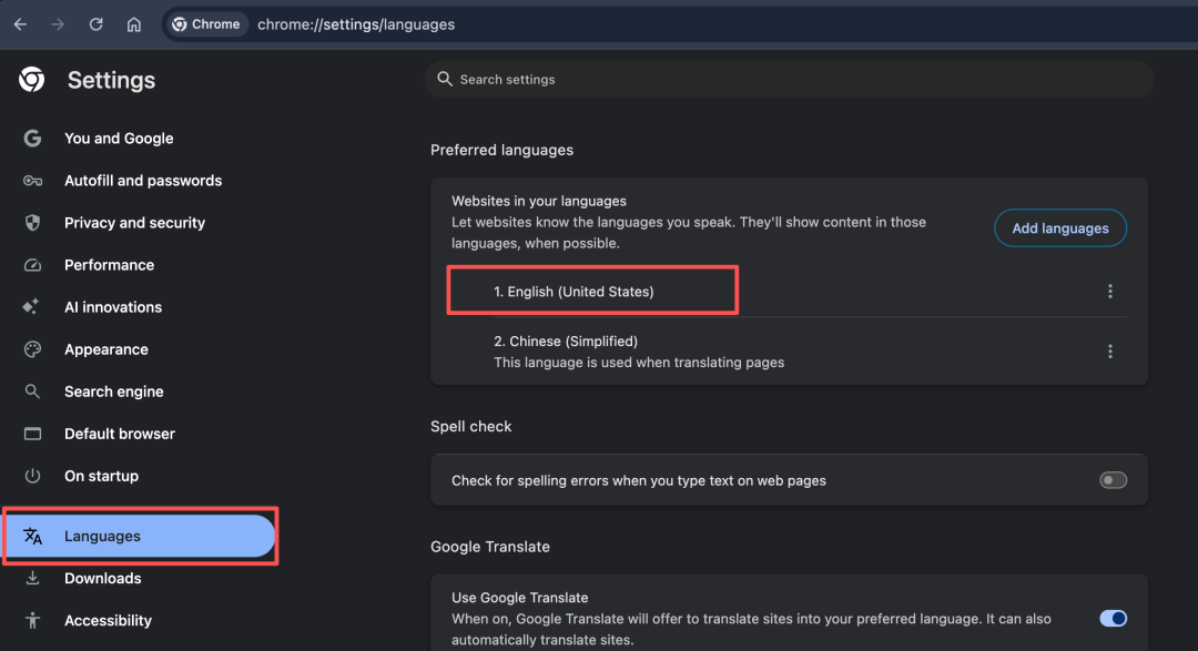 如果是MacOS系统,需要在“设置”—“语言与地区”—“应用程序”中,添加Google Chrome,语言选择“英文”。