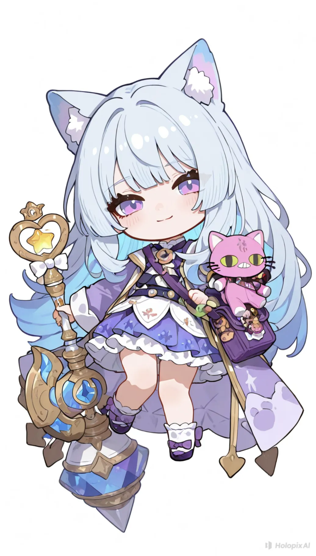 “Q版可爱猫娘法师,蓝色长发,紫色法袍,手持魔杖,横版2D游戏立绘,动作自然,正面视角。”
