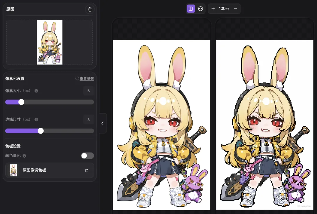 其实现在人物风格已经满足我的需求了,但是如果我们的游戏改成了像素风格,那么这些人是不是需要重新设计呢?当然不用,Holopix的高级应用中有一个像素图转换工具,能够一键把图片转为像素风格,省去大量的工作量和时间。